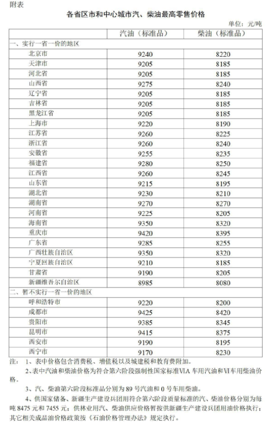 附:各省區(qū)市和中心城市汽、柴油最高零售價(jià)格
