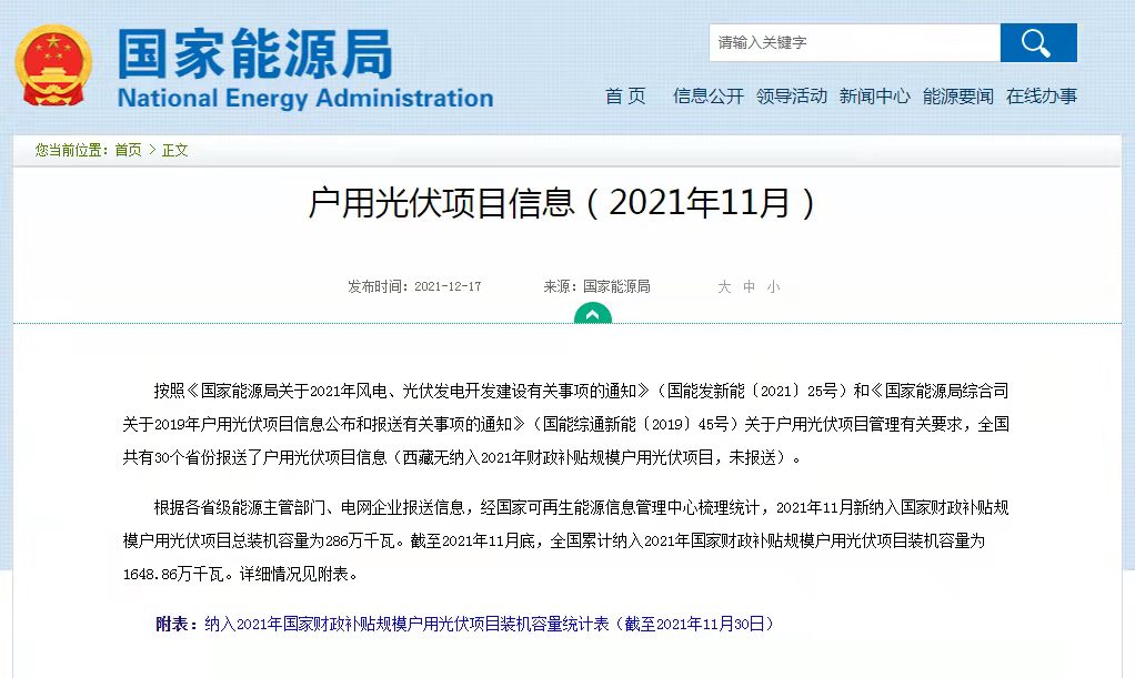 根據各省級能源主管部門、電網企業報送信息,經國家可再生能源信息管理中心梳理統計,2021年12月新納入國家財政補貼規模戶用光伏項目總裝機容量為508.98萬千瓦。截至2021年12月底,全國累計納入2021年國家財政補貼規模戶用光伏項目裝機容量為2159.62萬千瓦。詳細情況見附表。