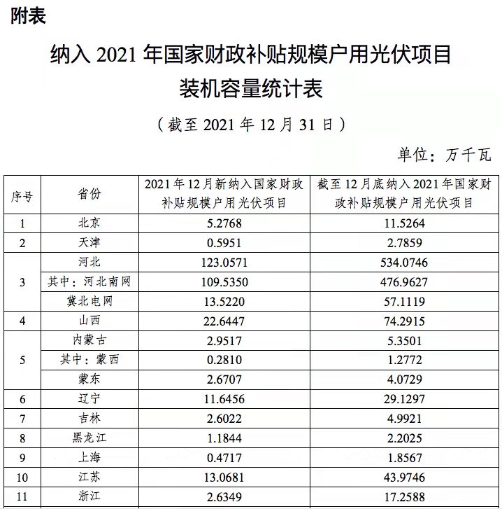 附表:納入2021年國家財政補貼規模戶用光伏項目裝機容量統計表(截至2021年12月31日)
