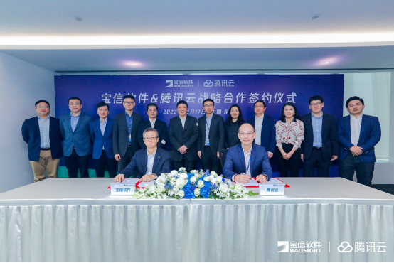 在寶信軟件總經理王劍虎、高級副總經理宋健海和騰訊云高級副總裁陳廣域、騰訊云副總裁石梅的見證下,寶信軟件副總經理張雷與騰訊云副總裁陳平代表雙方簽署合作協議。