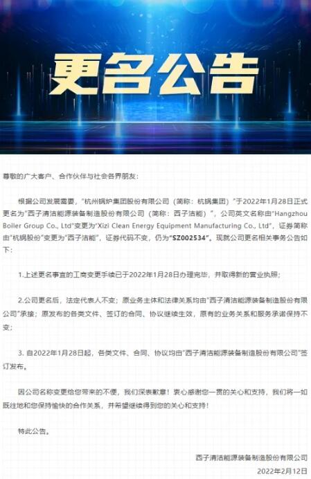2022年無疑是西子轉型升級的關鍵一年,為順應公司的發展需要,2月12日,西子潔能正式發布了關于公司更名的公告。公告顯示,自2022年1月28日起,“杭州鍋爐集團股份有限公司(簡稱:杭鍋集團)”正式更名為“西子清潔能源裝備制造股份有限公司(簡稱:西子潔能)”,公司英文名稱由“Hangzhou Boiler Group Co., Ltd”變更為“Xizi Clean Energy Equipment Manufacturing Co., Ltd”,證券簡稱由“杭鍋股份”變更為“西子潔能”,證券代碼仍為“SZ002534”。