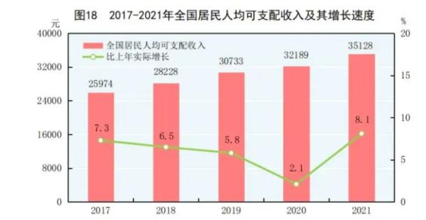 居民收入與經濟增長基本同步。2021年全國居民人均可支配收入35128元,比上年實際增長8.1%,快于人均GDP增速,與GDP增速同步。