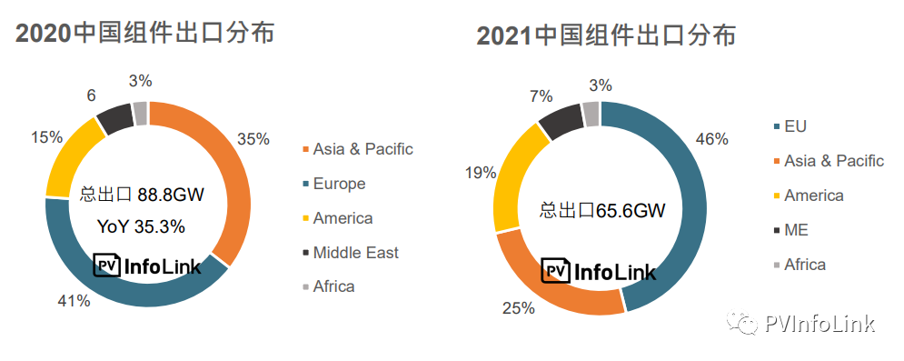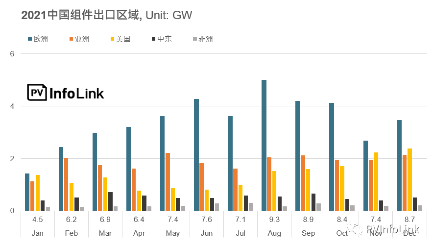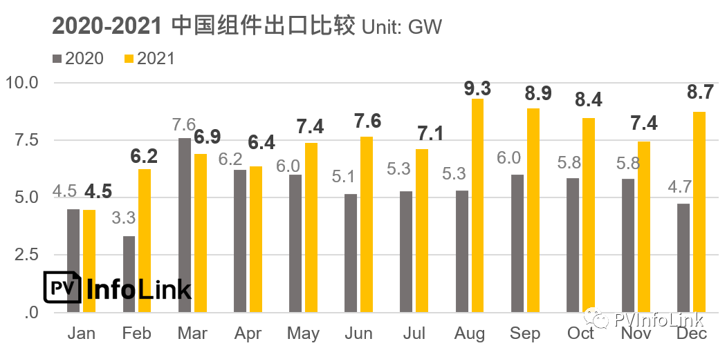 2021光伏產(chǎn)業(yè)面臨動(dòng)蕩的一年,歷經(jīng)了多晶硅暴漲,以及中國(guó)的能耗管控政策,供應(yīng)鏈價(jià)格劇烈波動(dòng),但全球光伏裝機(jī)仍是繳出了優(yōu)異的成績(jī)。根據(jù)PV InfoLink統(tǒng)計(jì),2021年的全球光伏新增裝機(jī)容量達(dá)到172.6 GW,同比成長(zhǎng)23.1%,其中,非中國(guó)市場(chǎng)的裝機(jī)量來(lái)到了124.6GW,同比成長(zhǎng)了30.1%。海外需求的快速成長(zhǎng)也帶動(dòng)了中國(guó)光伏組件的出口,根據(jù)PV InfoLink統(tǒng)計(jì)中國(guó)海關(guān)出口資料,中國(guó)在2021出口組件總量來(lái)到了88.8GW,同比成長(zhǎng)了35.3%。主要的成長(zhǎng)來(lái)源仍是歐洲、巴西和印度等主要光伏市場(chǎng)。