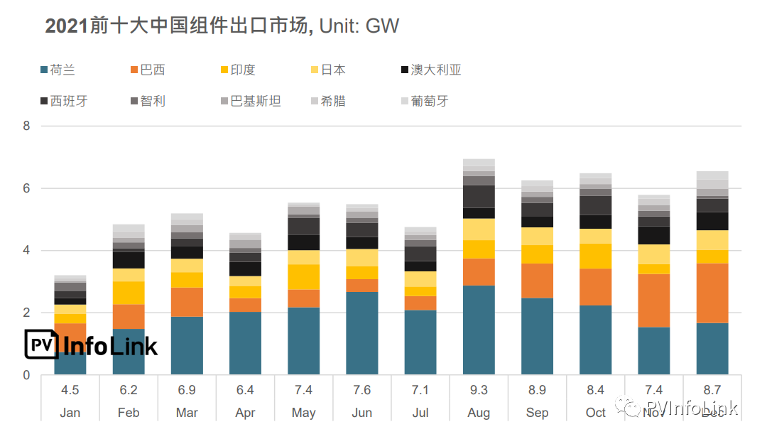 中國(guó)2021年出口了40.9GW的組件到歐洲市場(chǎng),相較前一年的26.7GW同比成長(zhǎng)了54%。受惠于能源轉(zhuǎn)型趨勢(shì),歐洲持續(xù)維持最大的組件進(jìn)口市場(chǎng),全球占比46%。主要的國(guó)家包括了荷蘭、西班牙、希臘、葡萄牙、波蘭和德國(guó),都達(dá)到了GW級(jí)以上的進(jìn)口量,其中荷蘭為中國(guó)的第一大出口國(guó),全年總量來(lái)到了23.8GW。但是在十一月時(shí),受到了歐洲法院專(zhuān)利判決的影響,部分廠(chǎng)家無(wú)法銷(xiāo)售受影響產(chǎn)品,進(jìn)口量快速下滑。