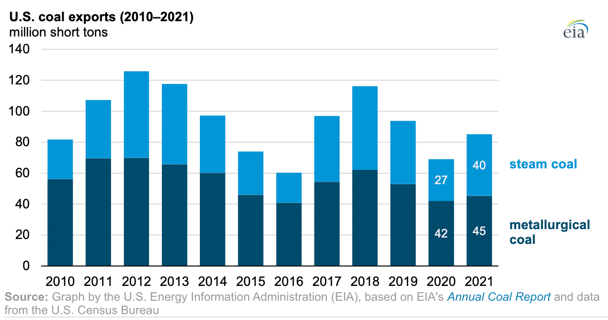 據(jù)美國能源信息署的數(shù)據(jù),2021 年美國煤炭出口量從 2020 年的 6900萬短噸增長23%至 8500萬短噸。動力煤出口增長 47%至4000萬短噸,冶金煤出口增長8%至4500萬短噸。2021年,美國煤炭出口占國內(nèi)煤炭產(chǎn)量比重升至15%。