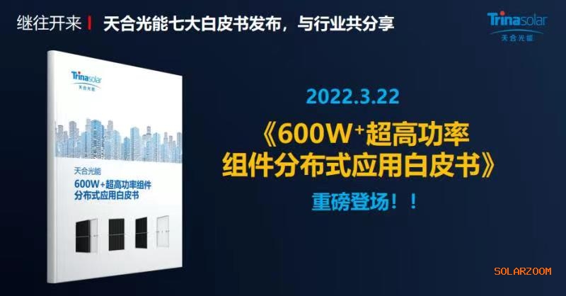 3月22日,天合光能重磅發布《600W+超高功率組件分布式應用白皮書》,系統解析用戶關心的7大熱點問題。白皮書客觀正視600W+分布式發展過程中的挑戰并給出全套解決方案,將進一步提升分布式光伏效率,建設完善的600W+分布式光伏生態,也將有力助推分布式光伏整縣推進及全社會低碳化目標實現。