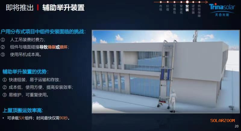 同期,天合光能還發布針對分布式施工研發的輔助舉升設備和快捷安裝解決方案,組件安裝施工過程可縮短40%時間!每一分錢的節省、每一分鐘工期的縮短,對項目投資都有重要意義,也將助推分布式光伏整縣推進的快速進行。