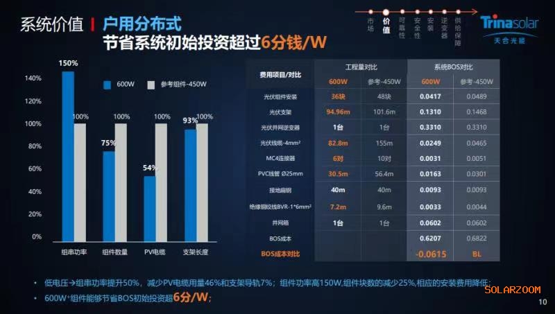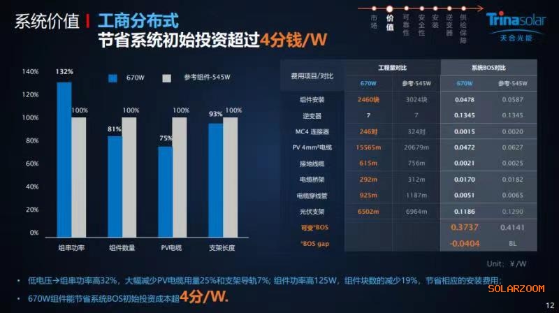 由于組件功率提升,安裝塊數減少,使得600W+在工商分布式場景下,至尊670W組件對比參考545W組件,節省系統初始投資成本超4分錢/W。670W組件組串功率更高,大幅減少PV電纜用量和支架導軌,組件塊數的減少也相對節省了安裝費用,這一成本節省甚至高達1毛錢/W。這將成為低碳化、能耗雙控、綠電交易下,又一激發業主選擇超高功率組件的關鍵原因。