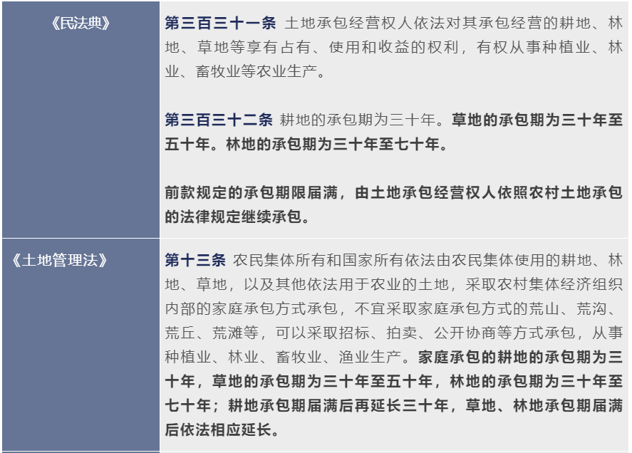 第二輪土地承包即將到期,《民法典》《土地管理法》和《農村土地承包法》均對土地承包續期問題作出了規定,具體情況如下表: