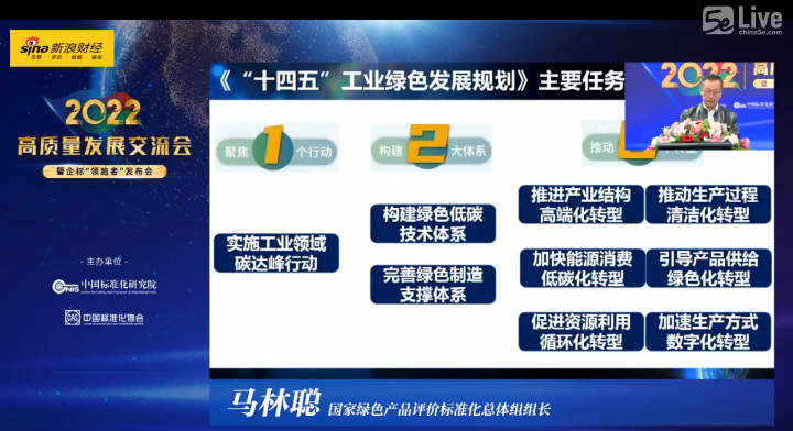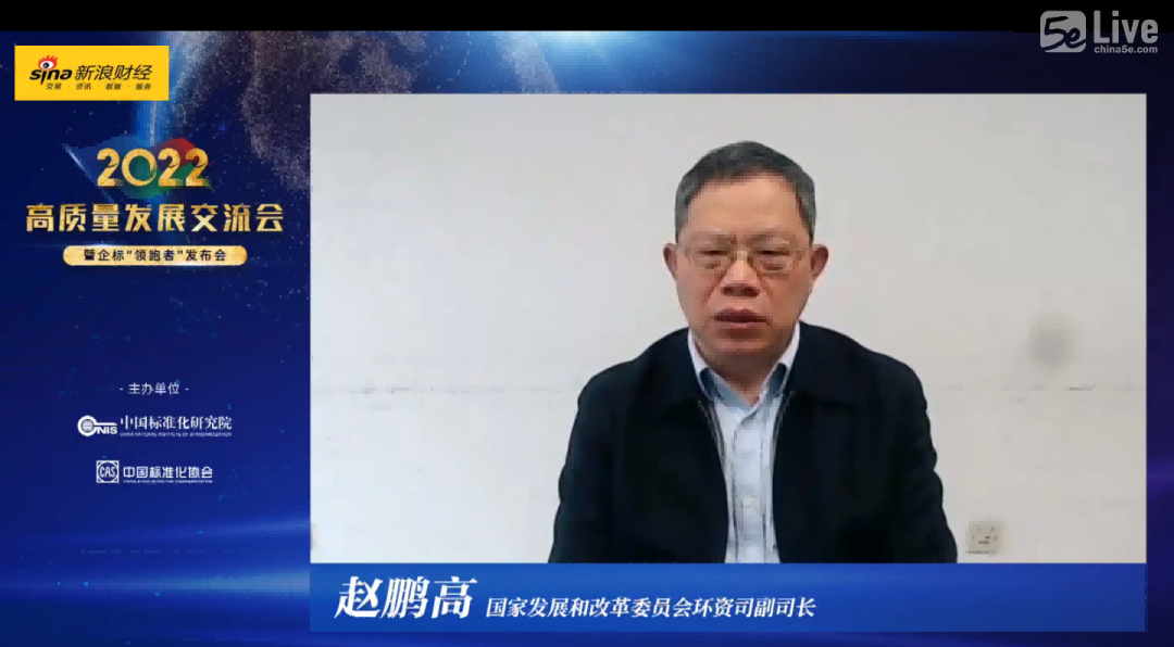 國家發展改革委環資司趙鵬高副司長、國家市場監管總局標準創新管理司肖寒副司長、國家市場監管總局認證監管司原正副司長(正司級)薄昱民女士、中國標準化研究院李治平副院長、中國標準化協會于欣麗理事長、新浪財經CEO鄧慶旭先生以及相關專家、代表參加此次線上直播大會。