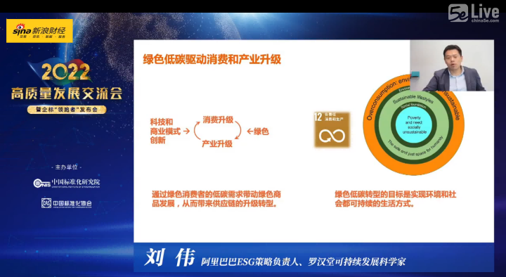 國家綠色產品評價標準化總體組馬林聰組長、中國消費者協會王振宇秘書長、阿里巴巴ESG策略負責人劉偉博士、新浪財經高級總監高軍委先生、雙碳專項公益基金頓寶紅副秘書長、天貓社會責任負責人郝紫紫女士等分別就“工業綠色發展政策要求及國家統一綠色產品標準”、“高標準助推高質量發展消費公平引領品質消費”、“共建綠色低碳美好生活”、“打造消費服務矩陣共建無憂消費環境”、“推動高質量的綠色消費”、“首批雙碳專項公益基金項目”幾項主題做了主題報告。