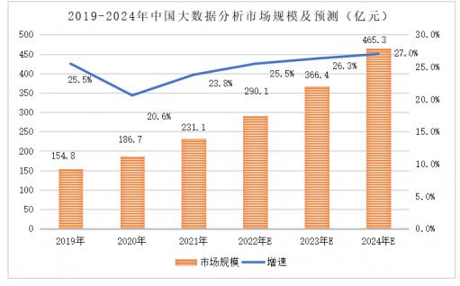 近年來,伴隨下游行業對全業務流程數字化運營需求的持續廣泛和深入,大數據分析市場取得了良好發展,呈現出高速發展態勢。賽迪CCID統計,我國大數據分析市場規模由2019年的154.8億元增長至2021年的231.1億元,復合年增長率達到22.2%,大數據分析市場規模包含了大數據分析挖掘、應用相關的軟件產品和服務市場收入。未來大數據與實體經濟加速融合,將持續推動大數據分析相關產品和服務在金融、政府、電信、互聯網、健康醫療、工業、交通運輸、教育、電力等領域的融合發展,未來大數據分析市場將不斷發展壯大,預計2024年我國大數據分析市場規模將達到465.3億元,未來三年復合年增長率26.6%。