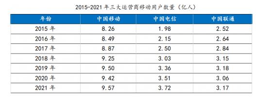 目前,電信行業傳統主業趨于飽和,運營商業績增長集體放緩,紛紛轉型發力增值服務,數字資產被高度重視,積極擁抱數字化轉型機遇,深耕客戶需求及應用場景。運營商擁有大量用戶,截至2021年末,三大運營商移動用戶數量分別達到了中國移動9.57億人、中國電信3.72億人和中國聯通3.17億人。大量用戶累積形成了豐富的用戶數據資源,如用戶上網行為、用戶通信行為、用戶的消費行為等綜合電信業務結構化數據,且數據資源應用價值和數據安全性較高,在大數據分析方面具有明顯優勢。