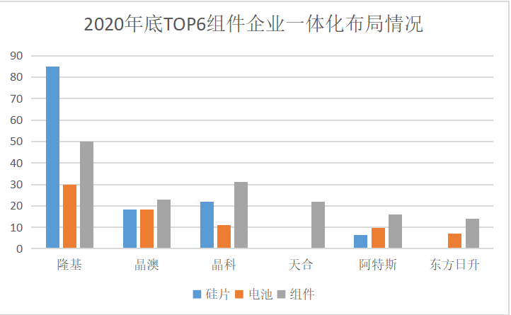 近兩年供應鏈分享的持續加劇使得組件企業一體化的決心與日俱增,在去年組件企業呈壓的狀態下,各頭部組件企業均有一體化布局,包括隆基、晶澳、晶科、天合、阿特斯、東方日升等。從以下的表格可以看出,與2020年相比,頭部企業2021年的一體化體力明顯提高。