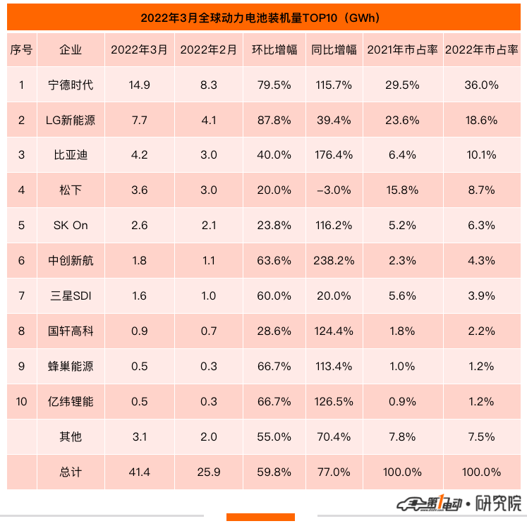 根據(jù)韓國市場研究機(jī)構(gòu)SNE Research數(shù)據(jù)顯示,2022年1-3月,全球動(dòng)力電池裝機(jī)量95.1GWh,環(huán)比上漲77.8%,同比增長93.3%。其中3月裝機(jī)量41.4GWh,環(huán)比增長59.8%,同比增長77%。