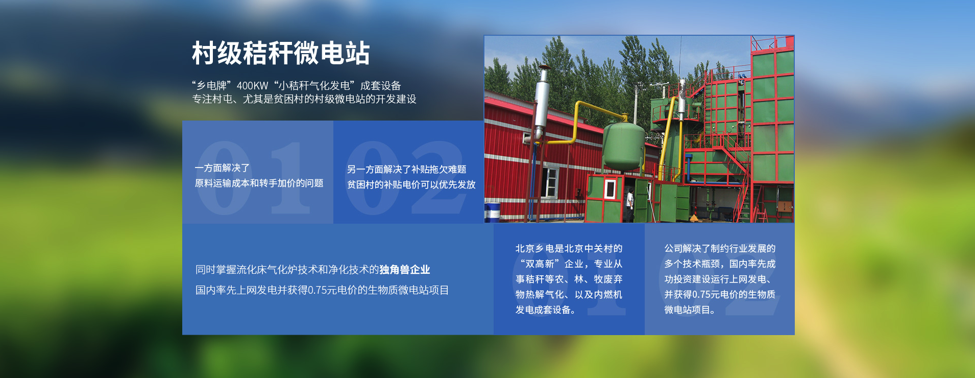 北京鄉電電力有限公司是專業從事“鄉村秸稈微電站”項目的核心設備提供商和全系統集成商,依托自身的技術優勢,開發出400kw小秸稈微電站成套設備,專注村屯、尤其是貧困村的村級微電站的開發建設,一方面解決了原料運輸成本和轉手加價的問題,另一方面貧困村的補貼電價可以優先發放,解決了補貼拖欠難題。