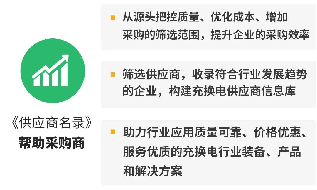 《供應商名錄》主要是幫助采購商從源頭把控質量、優化成本、增加采購的篩選范圍,提升企業的采購效率,助力行業應用質量可靠、價格優惠、服務優質的充換電行業裝備、產品和解決方案。