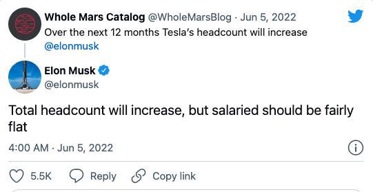 但隨后,6月5日,馬斯克在推特上稱,“(未來12個月)特斯拉員工總量將增長,領取固定薪酬的員工數(shù)量會相對平穩(wěn)。”