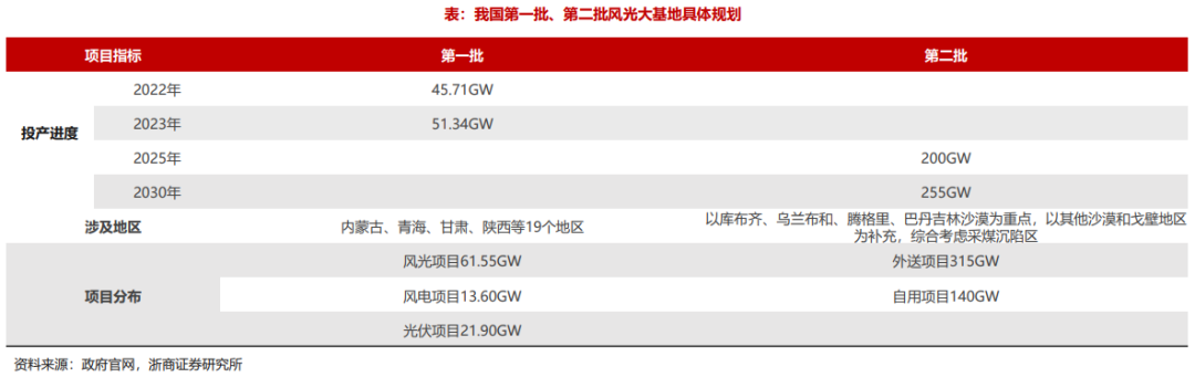 2021年11月,國家能源局、國家發改委印發《第一批以沙漠、戈壁、荒漠地區為重點的大型風電、光伏基地建設項目清單的通知》,第一批規劃風光基地97.05GW,項目投產時間為2022-2023年。