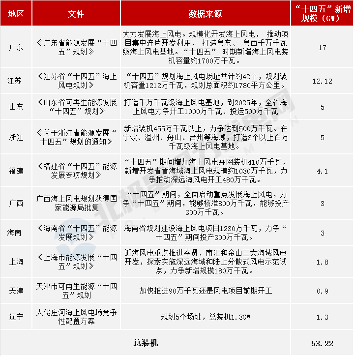 據統計,沿海各省規劃的“十四五”海上風電開發目標超過5000萬千瓦,其中廣東、浙江、江蘇、山東省規劃體量較大,分別達到17GW、5GW、12.12GW、8GW。扣除2021年新增裝機的1448萬千瓦,還有超過3500萬千瓦新增空間。