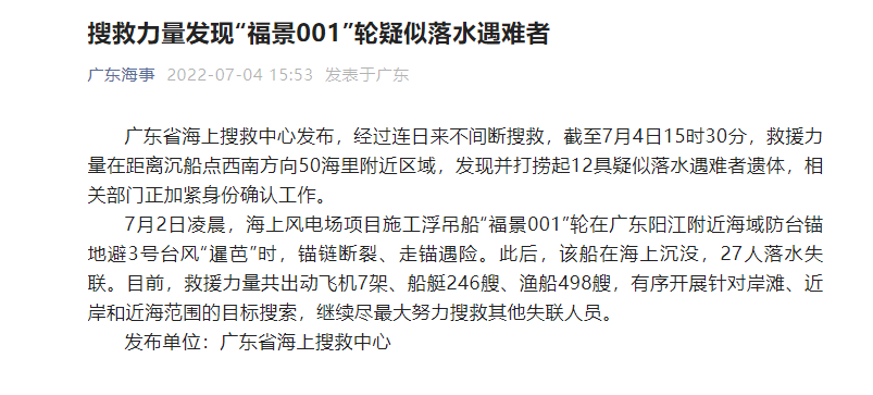 7月2日凌晨,海上風(fēng)電場(chǎng)項(xiàng)目施工浮吊船“福景001”輪在廣東陽(yáng)江附近海域防臺(tái)錨地避3號(hào)臺(tái)風(fēng)“暹芭”時(shí),錨鏈斷裂、走錨遇險(xiǎn)。此后,該船在海上沉沒(méi),27人落水失聯(lián)。目前,救援力量共出動(dòng)飛機(jī)7架、船艇246艘、漁船498艘,有序開(kāi)展針對(duì)岸灘、近岸和近海范圍的目標(biāo)搜索,繼續(xù)盡最大努力搜救其他失聯(lián)人員。
