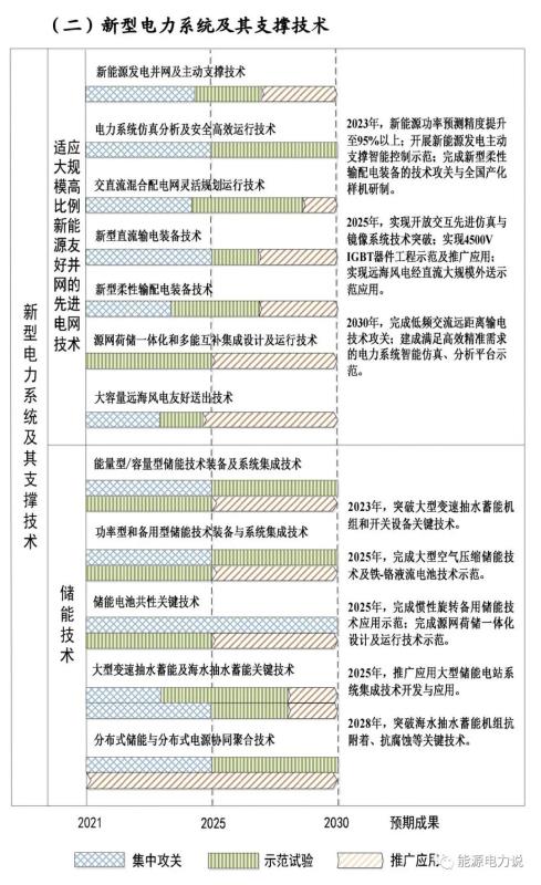 4月2日,國家能源局、科學技術部印發《“十四五”能源領域科技創新規劃》。《規劃》發布了先進可再生能源發電及綜合利用技術、新型電力系統及其支撐技術、能源系統數字化智能化技術等5大技術路線圖。其中在新型電力系統技術路線圖中,也公布儲能技術路線圖,“十四五”儲能技術創新包括: