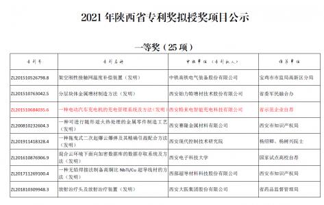 近日,2021年度陜西省專利獎擬授獎項目已公示。西安特來電智能充電科技有限公司發明專利“一種電動汽車充電機的充電管理系統及方法”榮獲2021年陜西省專利獎一等獎。