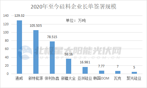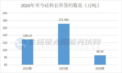 具體到企業來看,自2020年以來,通威硅料長單簽約總量最大,累計達129.32萬噸。其中,2022年簽約總量最大,分別與美科硅能源、雙良節能、云南宇澤簽署了高達105.94萬噸硅料長單。