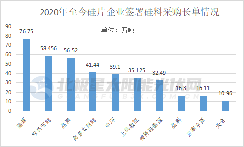 其中,硅片雙寡頭,隆基和中環自2020年以來分別宣布了超100GW、80GW大規模的擴產規劃。為保障產能落地,中環與保利協鑫、新疆大全分別簽署了35萬噸、4.1萬噸的長單合約。隆基分別與新特能源、通威、亞洲硅業、保利協鑫和OCIM簽署了27萬噸、20.36萬噸、12.48萬噸、9.14萬噸和7.77萬噸,總量達76.75萬噸。