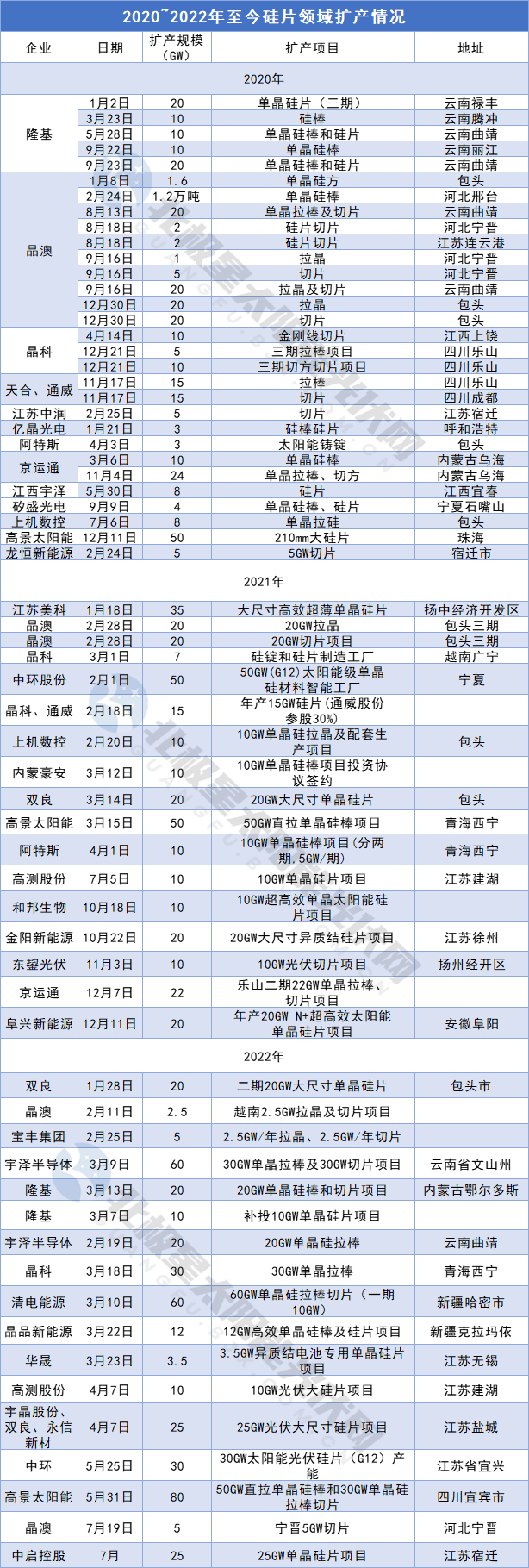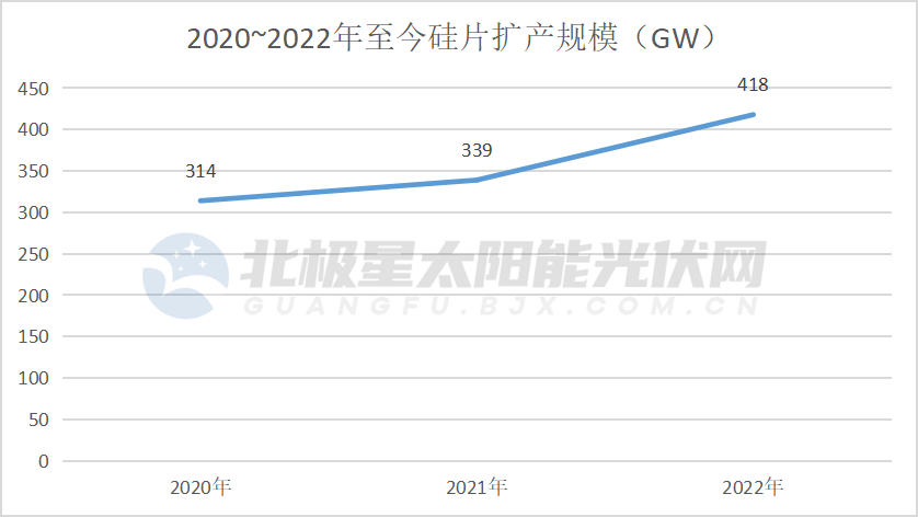 據(jù)北極星跟蹤數(shù)據(jù),2020~2022年瘋狂的擴(kuò)產(chǎn)潮下,硅片數(shù)據(jù)均首屈一指,僅今年上半年,擴(kuò)產(chǎn)規(guī)模便高達(dá)400GW+。