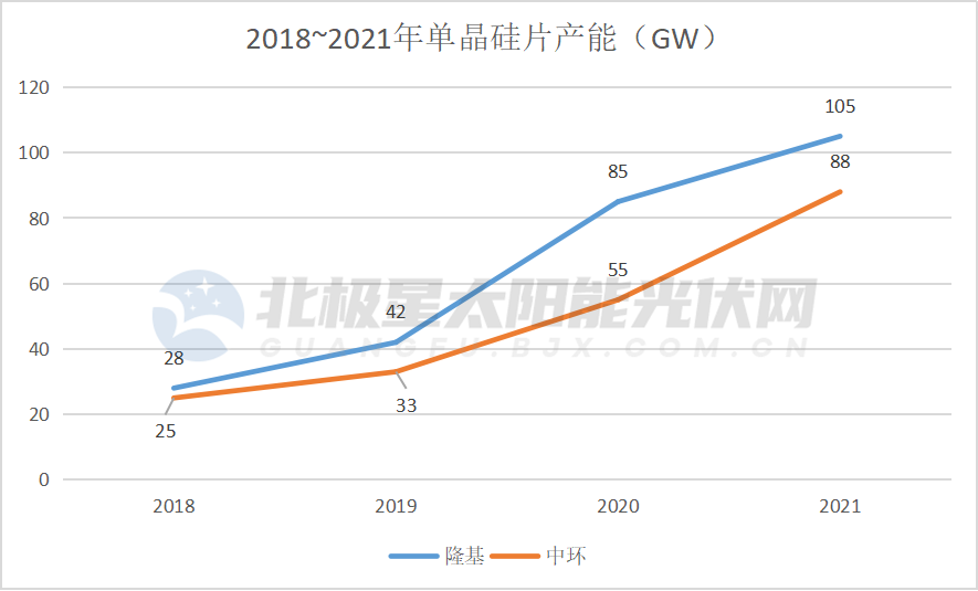 無論是產(chǎn)能數(shù)據(jù)亦或市場(chǎng)份額,隆基、中環(huán)可謂牢牢固守著“雙雄稱霸”的戰(zhàn)局。財(cái)報(bào)數(shù)據(jù)顯示,截至2021年底,隆基單晶硅片產(chǎn)能達(dá)105GW,也是至今首個(gè)產(chǎn)能破百的硅片企業(yè),2022年目標(biāo)產(chǎn)能150GW。