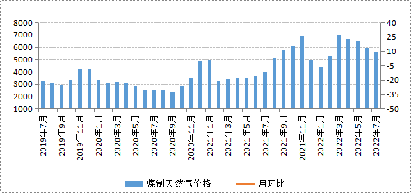 7月份,天然氣市場需求仍處于傳統(tǒng)消費淡季,市場交易氛圍清淡;同時,部分天然氣生產(chǎn)企業(yè)檢修結(jié)束,天然氣市場供應(yīng)有所增加,我區(qū)煤制天然氣價格延續(xù)前期小幅下降走勢。不過,受高溫天氣影響近期發(fā)電需求旺盛,所以7月下旬我區(qū)煤制天然氣價格有回升跡象。7月份我區(qū)煤制天然氣平均交易價格為5593.97元/噸,與6月份相比(下稱環(huán)比),價格下降5.63%;與2021年7月份相比(下稱同比),價格上漲39.20%,同比漲幅收窄24.55個百分點。