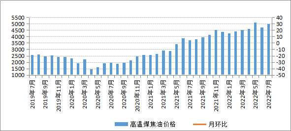 一方面,7月份高溫煤焦油市場存剛需支撐,但是下游深加工企業(yè)出現(xiàn)虧損,企業(yè)生產(chǎn)積極性降低,高溫煤焦油市場需求整體有所走弱;另一方面,焦企限產(chǎn)力度持續(xù)加大,高溫煤焦油供應(yīng)量縮減。在供應(yīng)縮減、需求偏弱的環(huán)境下,我區(qū)煤制高溫煤焦油價格小幅上漲。7月份,我區(qū)煤制高溫煤焦油平均交易價格為4978.87元/噸,環(huán)比上漲6.10%,同比上漲34.52%。