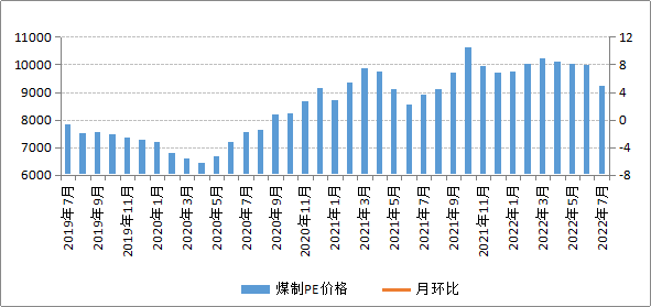 7月份,雖然PE生產(chǎn)企業(yè)檢修裝置較多,PE市場供應(yīng)有所減少,但是由于7月份依然是PE行業(yè)傳統(tǒng)消費淡季,PE市場需求整體偏弱,市場多以低價成交為主,所以我區(qū)煤制PE價格小幅下降。7月份,我區(qū)煤制PE平均交易價格為9240.08元/噸,環(huán)比下降7.37%,同比上漲3.72%。