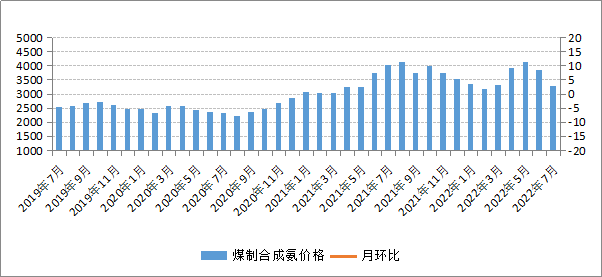 7月份,合成氨下游需求繼續(xù)走弱,企業(yè)多以剛需采購為主,合成氨市場供應(yīng)壓力漸增,市場交易氛圍較為冷清,我區(qū)煤制合成氨價格繼續(xù)小幅下降。7月份,我區(qū)煤制合成氨平均交易價格為3269.36元/噸,環(huán)比下降15.05%,同比下降18.32%。