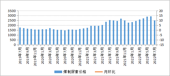 7月份,各地尿素農(nóng)業(yè)需求陸續(xù)收尾,尿素農(nóng)業(yè)采購量逐漸減少,而下游膠板行業(yè)因成品積壓以及近期降雨影響開工率繼續(xù)走低,尿素工業(yè)需求較往年同期減少。同時,7月份印度雖有尿素招標計劃,但在收緊的出口政策下對尿素市場行情暫無明顯利好支撐。總之,雖然7月份尿素裝置檢修不斷,日產(chǎn)有所下降,但是在需求走弱的環(huán)境下,尿素供應(yīng)壓力較大,推動我區(qū)煤制尿素價格高位回落。7月份,我區(qū)煤制尿素平均交易價格為2509.08元/噸,環(huán)比下降14.25%,同比略降0.26%。