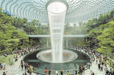 Kingspan公司的低能耗隔熱系統設計在新加坡樟宜機場的展示。樟宜機場玻璃穹頂由三角形和矩形結構組成,形成良好的熱煙通風系統,蔥蘢的室內花園中有高達7層的“雨漩渦”瀑布。