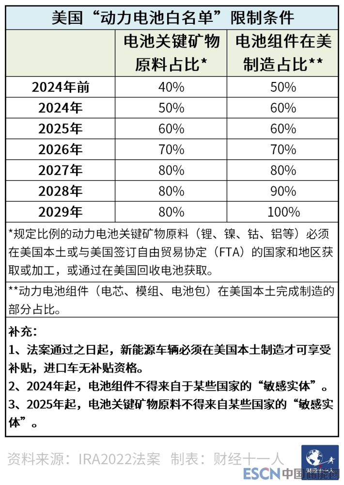 該法案中對中國企業影響最大的是對清潔能源汽車補貼設置了動力電池限制條款,該條款與中國在2015年-2019年執行的《汽車動力蓄電池行業規范條件》,即“動力電池白名單”頗為相似,因此也被稱為美國版“動力電池白名單”。