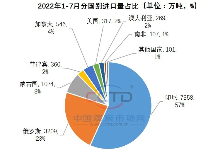 今年1-7月份,我國累計進口煤炭1.4億噸,同比下降18.5%。從前五大供應(yīng)國來看,印度尼西亞煤占比57%,俄羅斯煤占比23%,蒙古煤占比8%,加拿大煤占比4%,菲律賓煤占比2%。