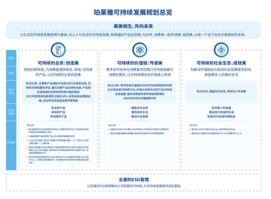 此前,珀萊雅已經(jīng)連續(xù)兩年發(fā)布《可持續(xù)發(fā)展報告》和《環(huán)境、社會與公司治理報告》。2022年,結(jié)合自身實際情況,帶著對社會可持續(xù)發(fā)展的承諾,珀萊雅發(fā)布了"可持續(xù)發(fā)展戰(zhàn)略規(guī)劃(2022-2025)"—"美美相生,共向未來",該發(fā)展規(guī)劃兼顧自身發(fā)展與社會貢獻,提出了"可持續(xù)的業(yè)務(wù)、可持續(xù)的價值鏈、可持續(xù)的社會生態(tài)"三大支柱,及對應(yīng)的可持續(xù)發(fā)展目標(biāo),期待在自身可持續(xù)發(fā)展轉(zhuǎn)型的帶動下,與行業(yè)同道、合作伙伴以及消費者并肩同行,既能不斷滿足消費者求"美"的需求,又共同創(chuàng)造可持續(xù)發(fā)展的行業(yè)生態(tài),實現(xiàn)可持續(xù)發(fā)展的長遠(yuǎn)目標(biāo)。