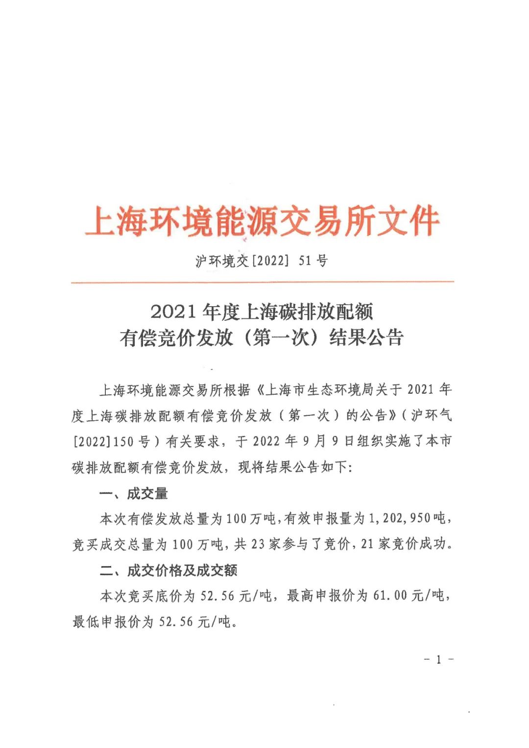9月9日,上海環(huán)境能源交易所公布了2021年度上海碳排放配額有償競(jìng)價(jià)發(fā)放(第一次)結(jié)果,數(shù)據(jù)顯示,共23家參與了競(jìng)價(jià)、21家競(jìng)價(jià)成功。競(jìng)買(mǎi)底價(jià)為52.56元/噸,最高申報(bào)價(jià)為61.00元/噸,統(tǒng)一成交價(jià)為52.56元/噸,總成交金額為5256萬(wàn)元。
