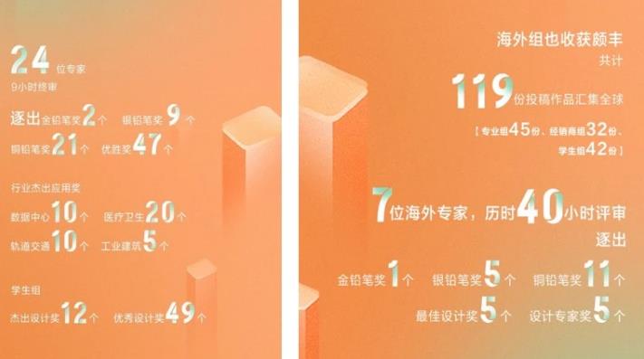 經全國24位暖通權威專家9小時的多輪嚴格篩選,于1000余份投稿入圍的368份作品中,評審團最終評出:金鉛筆獎2個,銀鉛筆獎9個,銅鉛筆獎21個,優勝獎47個,行業杰出應用獎:數據中心10個、醫療衛生20個、軌道交通10個、工業建筑5個、學生組杰出設計獎12個、學生組優秀設計獎49個,共計185個獲獎作品。此外,海外組匯集全球設計精英的119份投稿作品在9月22日的線上評審會上也給出了結果,逐出:金鉛筆1個,銀鉛筆5個,銅鉛筆11個,最佳設計獎5個,設計專家獎5個,共計27個作品獲獎。