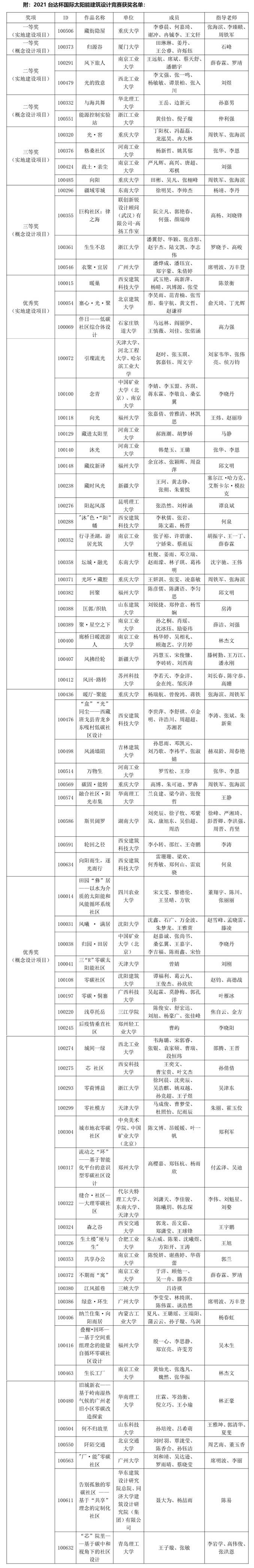 中國(guó)可再生能源學(xué)會(huì)太陽(yáng)能建筑專業(yè)委員會(huì)秘書長(zhǎng)鞠曉磊表示,臺(tái)達(dá)杯國(guó)際太陽(yáng)能建筑設(shè)計(jì)競(jìng)賽自2005年啟動(dòng)以來(lái),已成功舉辦十屆,收到來(lái)自國(guó)內(nèi)外9345個(gè)參賽團(tuán)隊(duì)提交的1873項(xiàng)有效作品,累計(jì)共有232所國(guó)內(nèi)高校、25所國(guó)外高校、120余家建筑相關(guān)企業(yè)參與。競(jìng)賽由國(guó)際太陽(yáng)能學(xué)會(huì)、中國(guó)建筑設(shè)計(jì)研究院有限公司等單位主辦,國(guó)家住宅與居住環(huán)境工程技術(shù)研究中心等單位承辦,臺(tái)達(dá)集團(tuán)冠名。2021年競(jìng)賽的主題是“陽(yáng)光·低碳社區(qū)”,開賽以來(lái),組委會(huì)共收到提交作品149件。通過多輪激烈角逐,評(píng)選出一等獎(jiǎng)二項(xiàng)、二等獎(jiǎng)四項(xiàng)、三等獎(jiǎng)八項(xiàng),以及優(yōu)秀獎(jiǎng)六十項(xiàng),作品的設(shè)計(jì)水平和設(shè)計(jì)質(zhì)量較往屆有較大的提升。