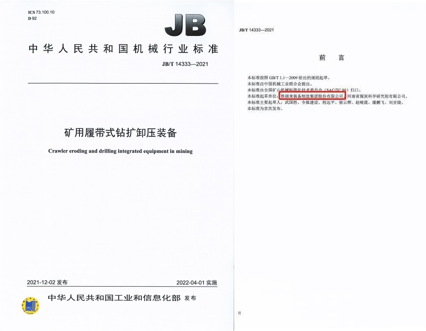 鐵福來集團(tuán)制定的“中華人民共和國機(jī)械行業(yè)標(biāo)準(zhǔn)JB/T14333-2021礦用履帶式鉆擴(kuò)卸壓裝備”正式上線發(fā)售。該標(biāo)準(zhǔn)由國家工業(yè)和信息化部發(fā)布,于2022年4月1日正式實施,該標(biāo)準(zhǔn)的制定充分彰顯了鐵福來集團(tuán)在煤礦防突鉆探領(lǐng)域技術(shù)及裝備實力。