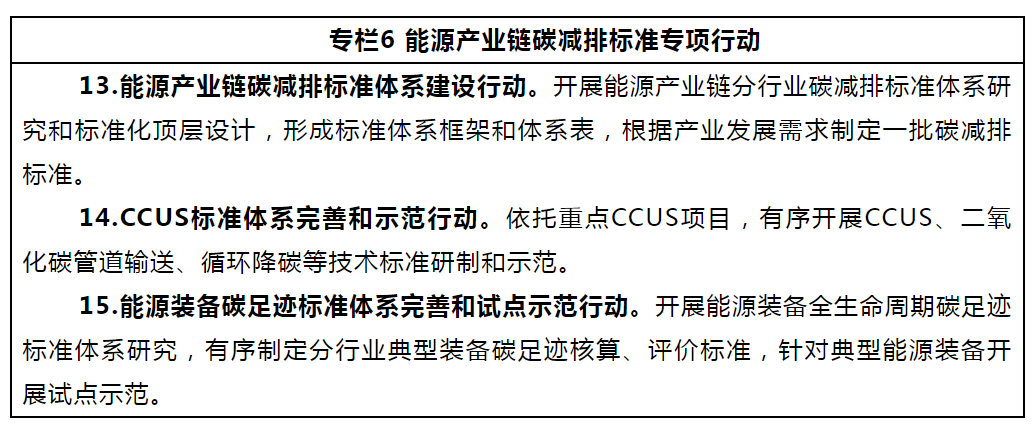 ——制定一批新興技術和產業鏈碳減排相關技術標準,健全相關標準組織體系,實現能源領域碳達峰產業鏈相關環節標準全覆蓋。