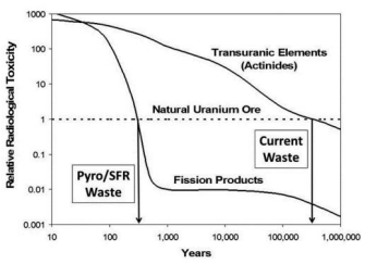 乏燃料中4%的裂變產(chǎn)物不能使用,仍需通過(guò)永久儲(chǔ)存的方式加以處置。因?yàn)榇蠖鄶?shù)長(zhǎng)壽命的同位素送去“再循環(huán)”了,因此裂變產(chǎn)物的輻射毒性在幾百年內(nèi)可衰變到天熱鈾的水平,與未經(jīng)處理、需要衰變幾千年的SNF相比短得多(見(jiàn)下圖)。