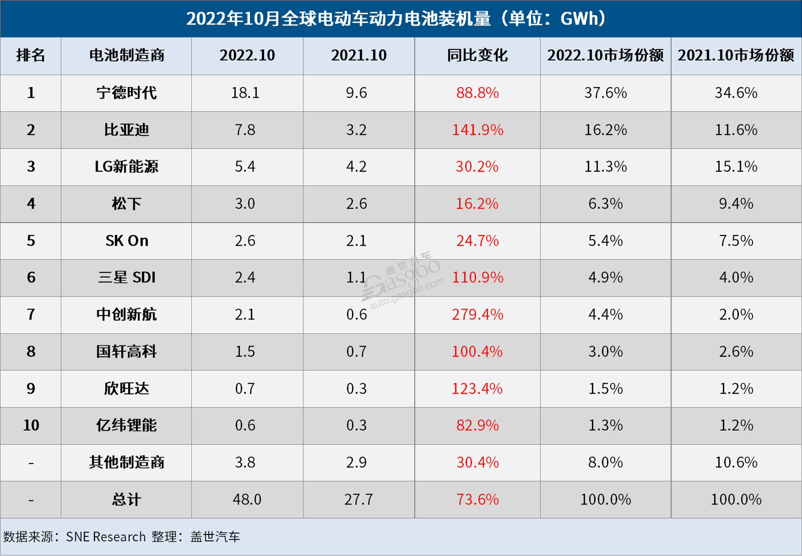 12月2日,韓國市場研究機構SNE Research公布的數據顯示,2022年10月,全球電動汽車電池裝機量達到48 GWh,同比增長73.6%,連續28個月保持穩定增長。在2021年創下“五連冠”的記錄后,寧德時代自年初以來已連續10個月在榜單中強勢領跑。比亞迪也不甘落后,一直與LG新能源角逐第二名,裝機量再創月度新高,并在榜單中再度奪得亞軍。