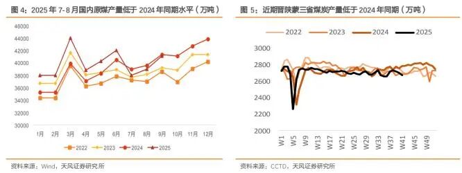 供給端方面,“查超產”政策已使得煤炭行業供需格局顯著改善。數據顯示,2025年7-8月,國內原煤產量同比轉跌,跌幅分別為3.8%和3.2%,年內供需累計盈余由1-6月的9629萬噸迅速降為1-8月的1496萬噸。