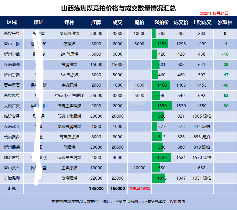 11月24日山西煉焦煤競拍價格統計表