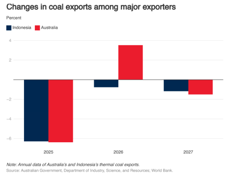 預計2026年全球煤炭產量將萎縮,印度是唯一預計煤炭供應將增長的主要生產國。2026年國際煤炭貿易預計將小幅下降,與亞洲進口量下降趨勢一致。這將削弱澳大利亞和印度尼西亞這兩大出口國的出口量,并導致價格面臨再度下行。